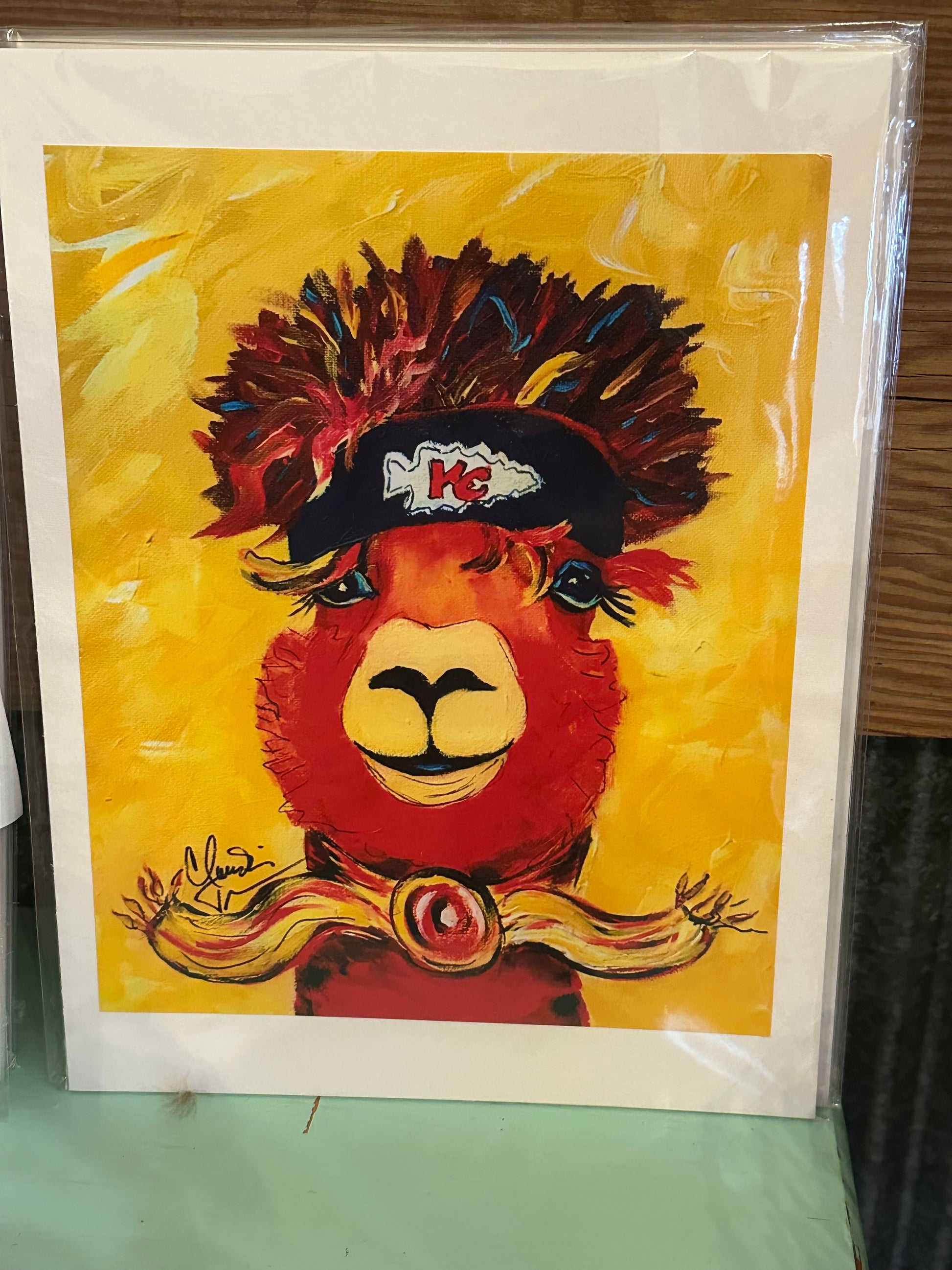 Adorable KC alpaca to cheer on our local team. Rebel dressed in a headband and Claudia True (local Overland Park artist) painted him. Prints are matted and ready to frame!